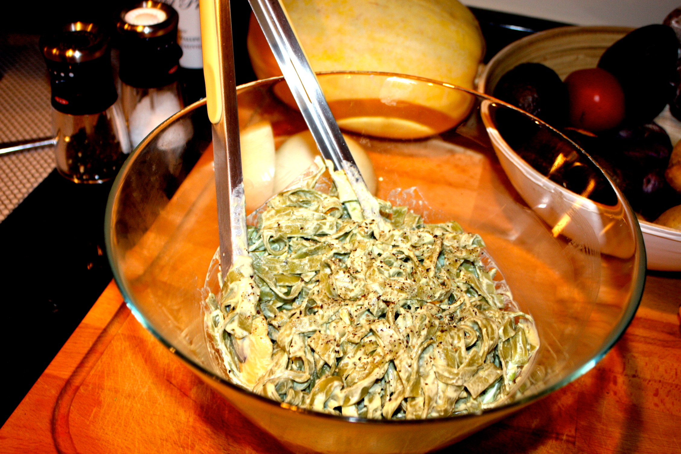 My dad used to make a spinach fettuccine when I was little that he would toss with sour cream, salt, pepper, and parmesan. I absolutely LOVED it, but now that I avoid gluten rich pastas and sour cream I’ve really been missing it. Since I finally got my paws on some gluten free spinach fettuccine, the goal was to recreate the sour cream with a little twist.