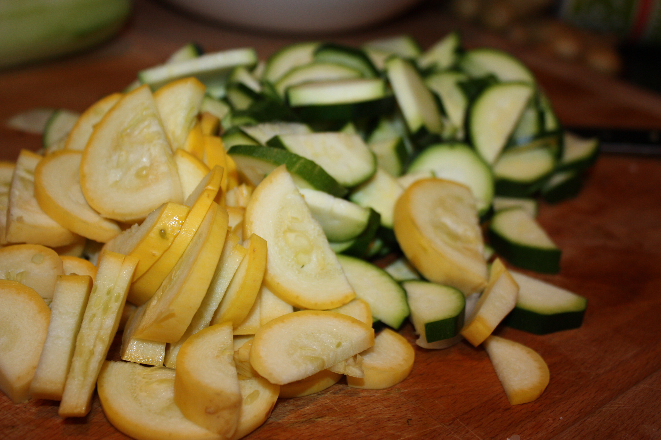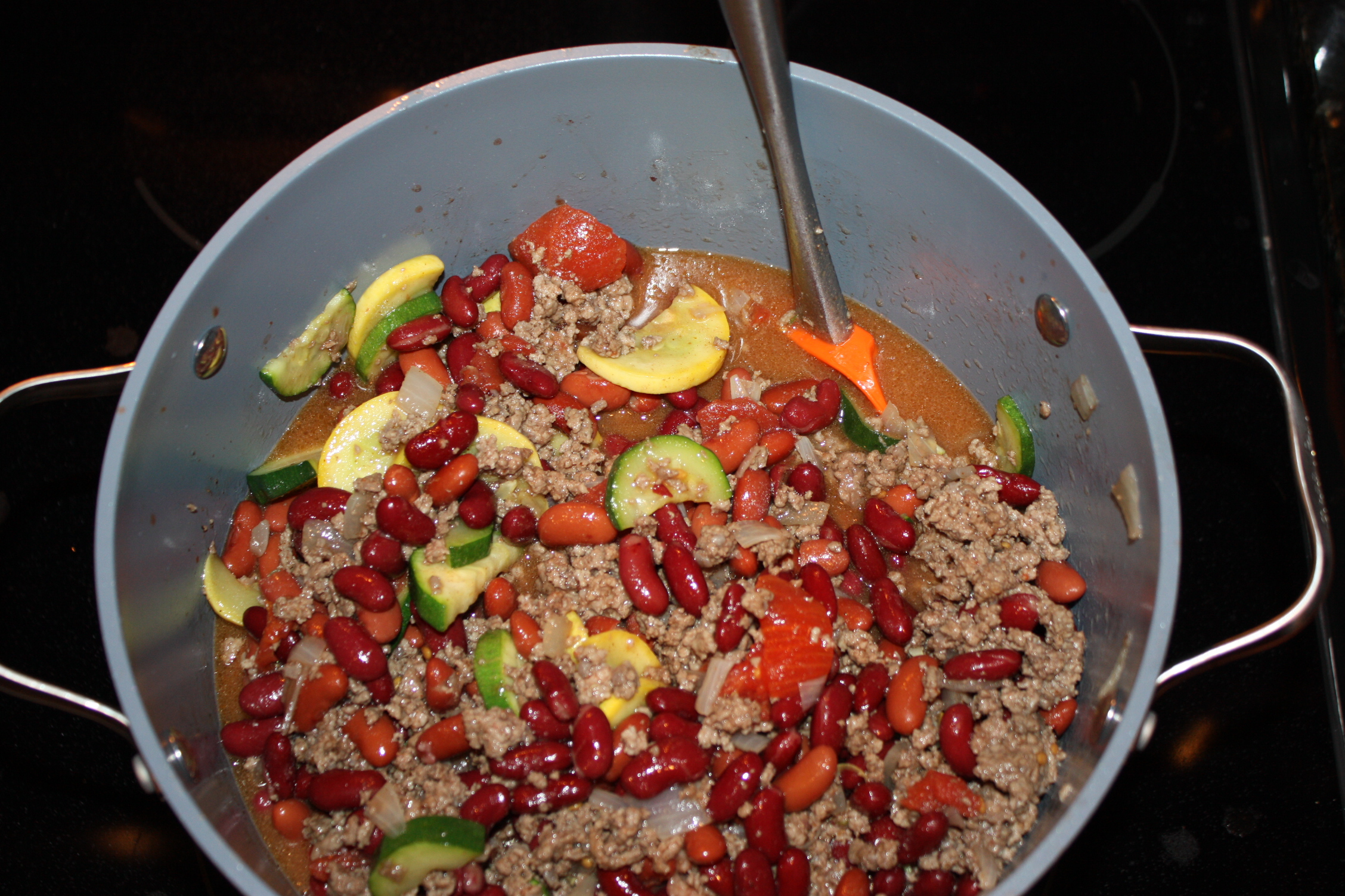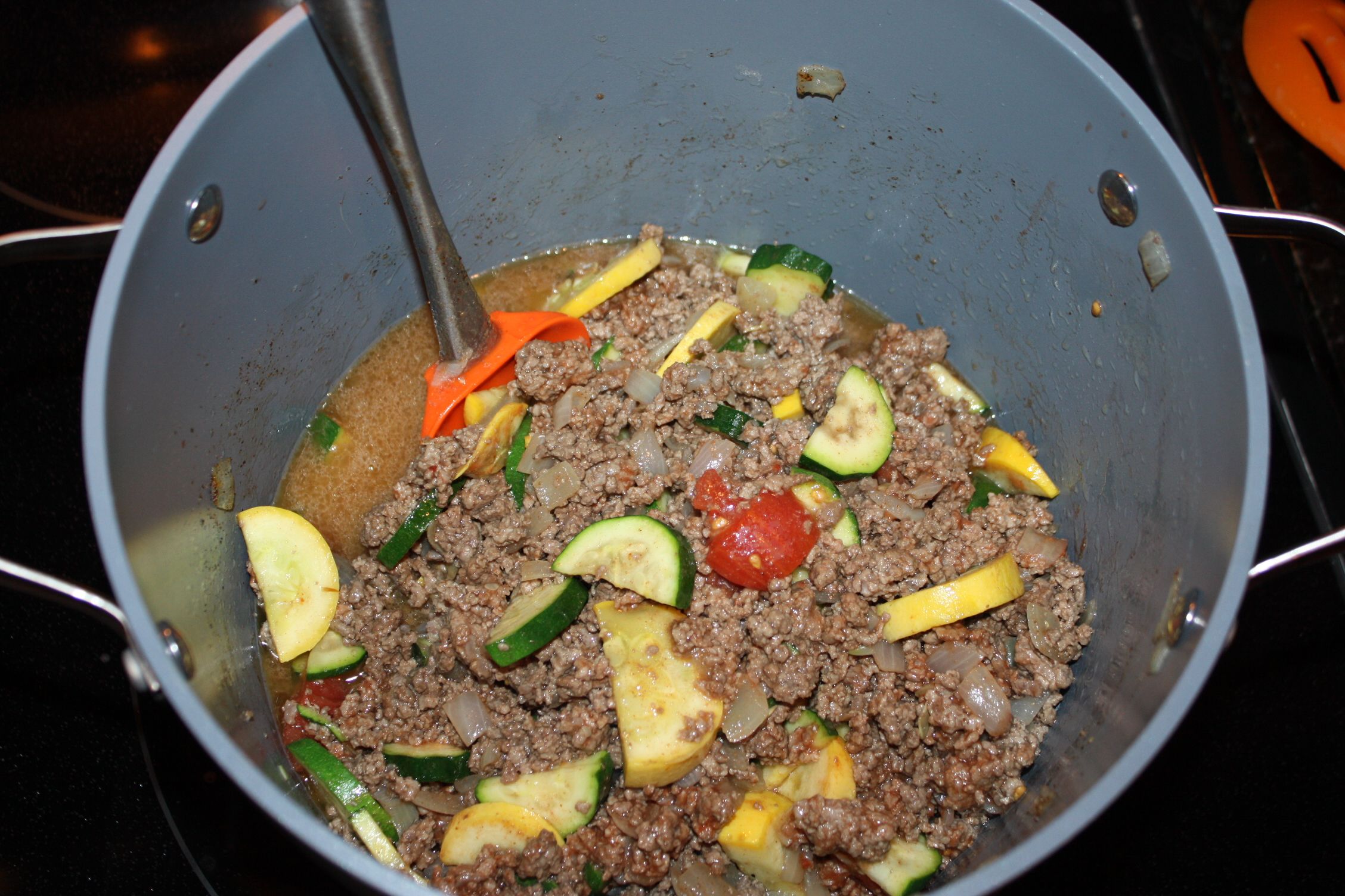 As the meat browned, I chopped up the zucchini & yellow squash and added it in to simmer with the meat.