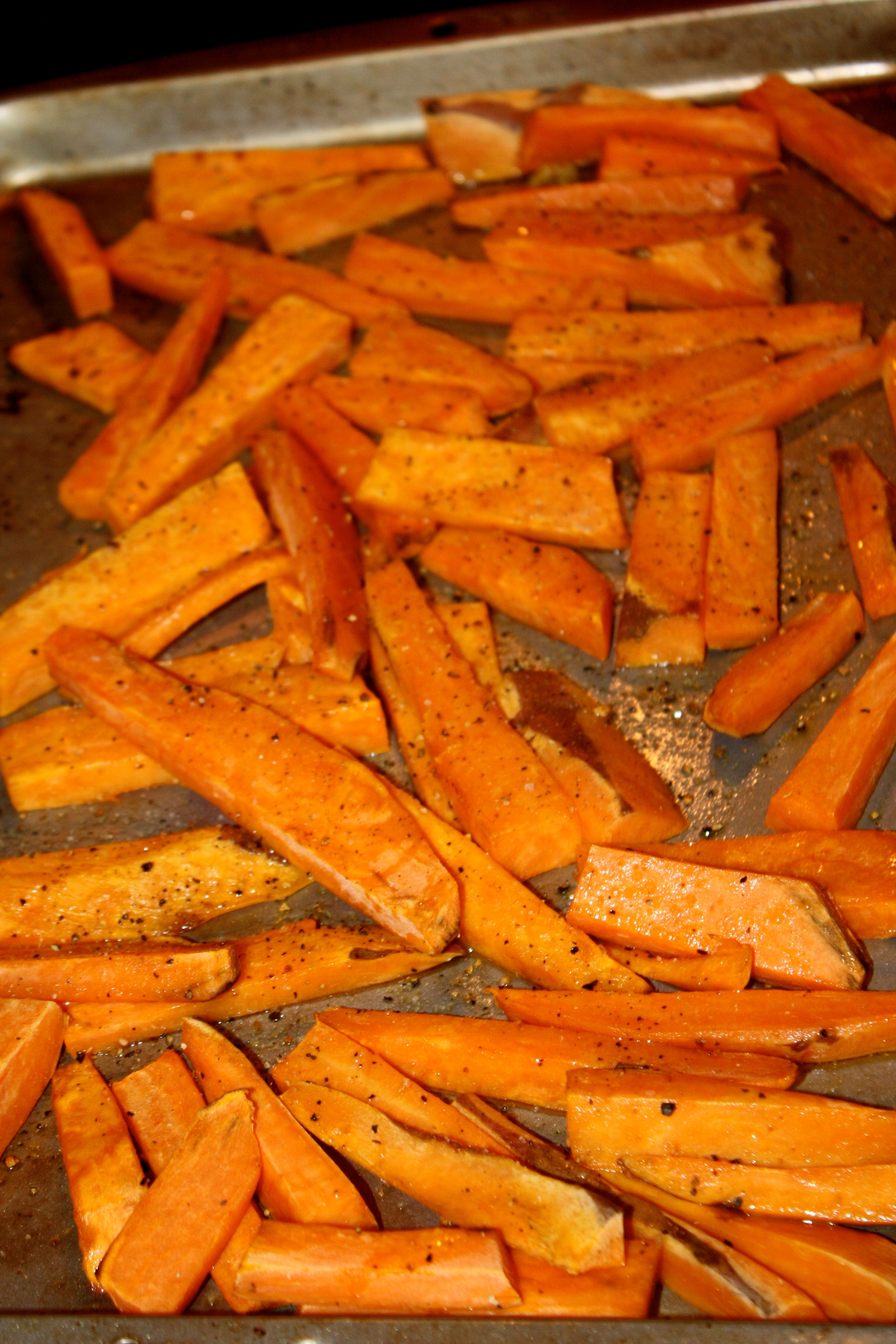 While the soup was boiling up, I took the ever-so neglected sweet potatoes that have been sitting next to the avocados for the last week or so, and prepared them for their sick-day destiny. Oven baked + broiled sweet potato fries.