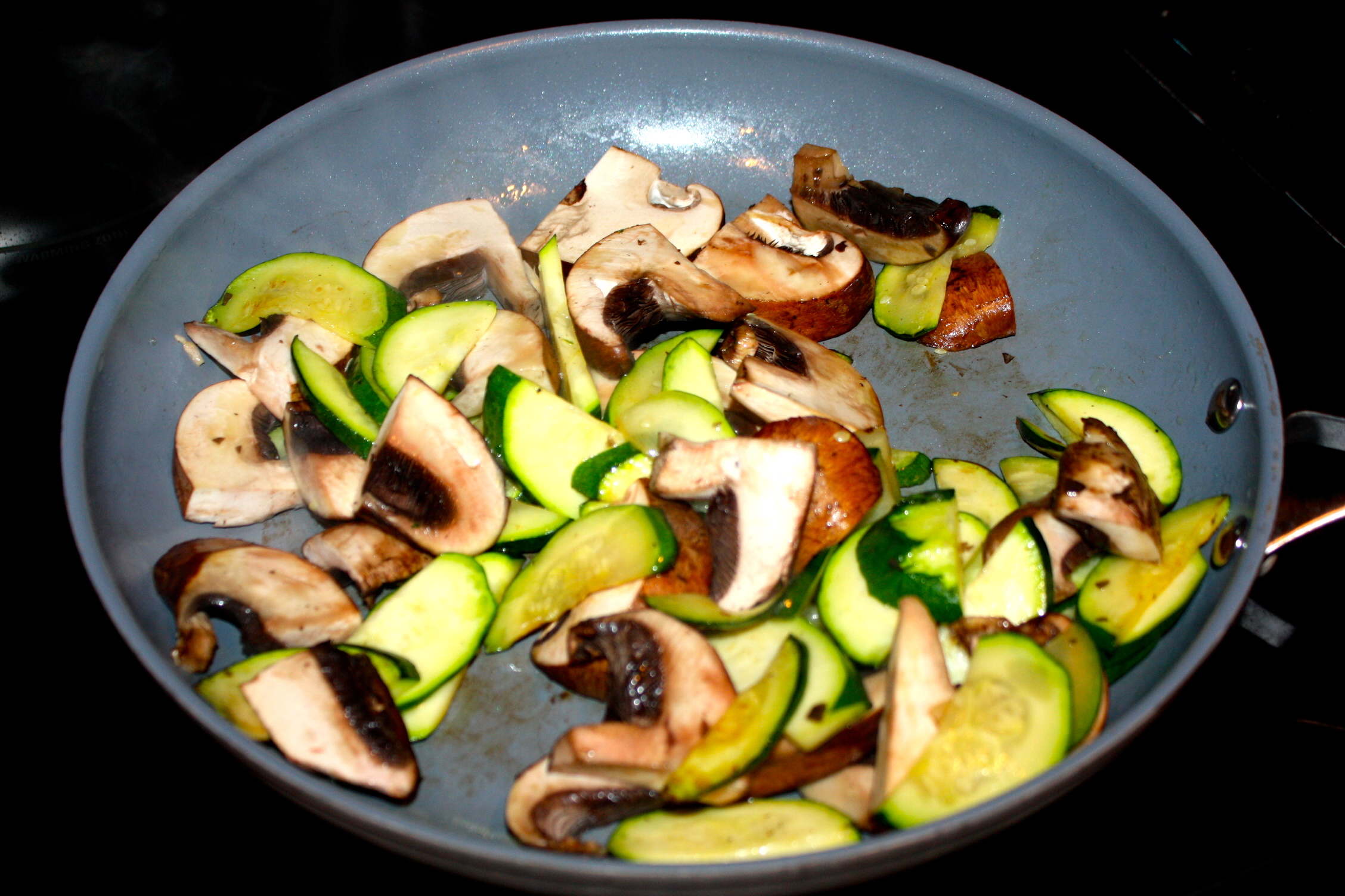 I started by sautéing zucchini with mushrooms and coconut oil.