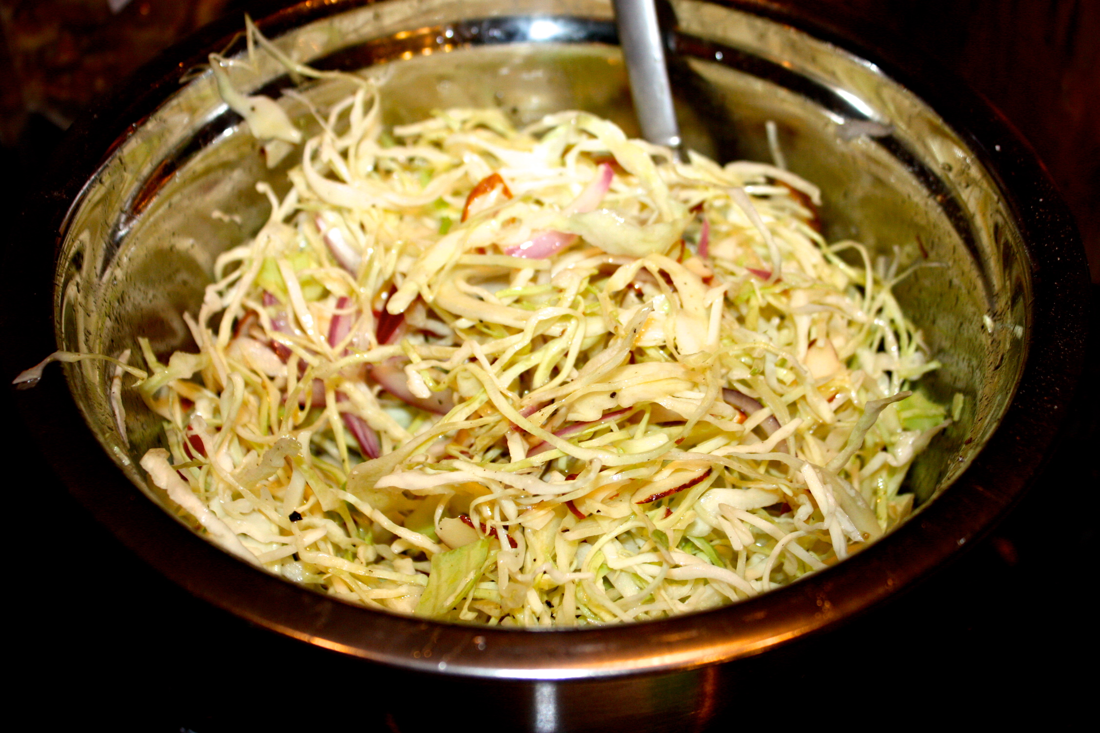 The salad for the meal was angel/thin cut cabbage, purple onion, slivered almonds, ground sea salt and pepper, mixed with white wine vinegar and olive oil.