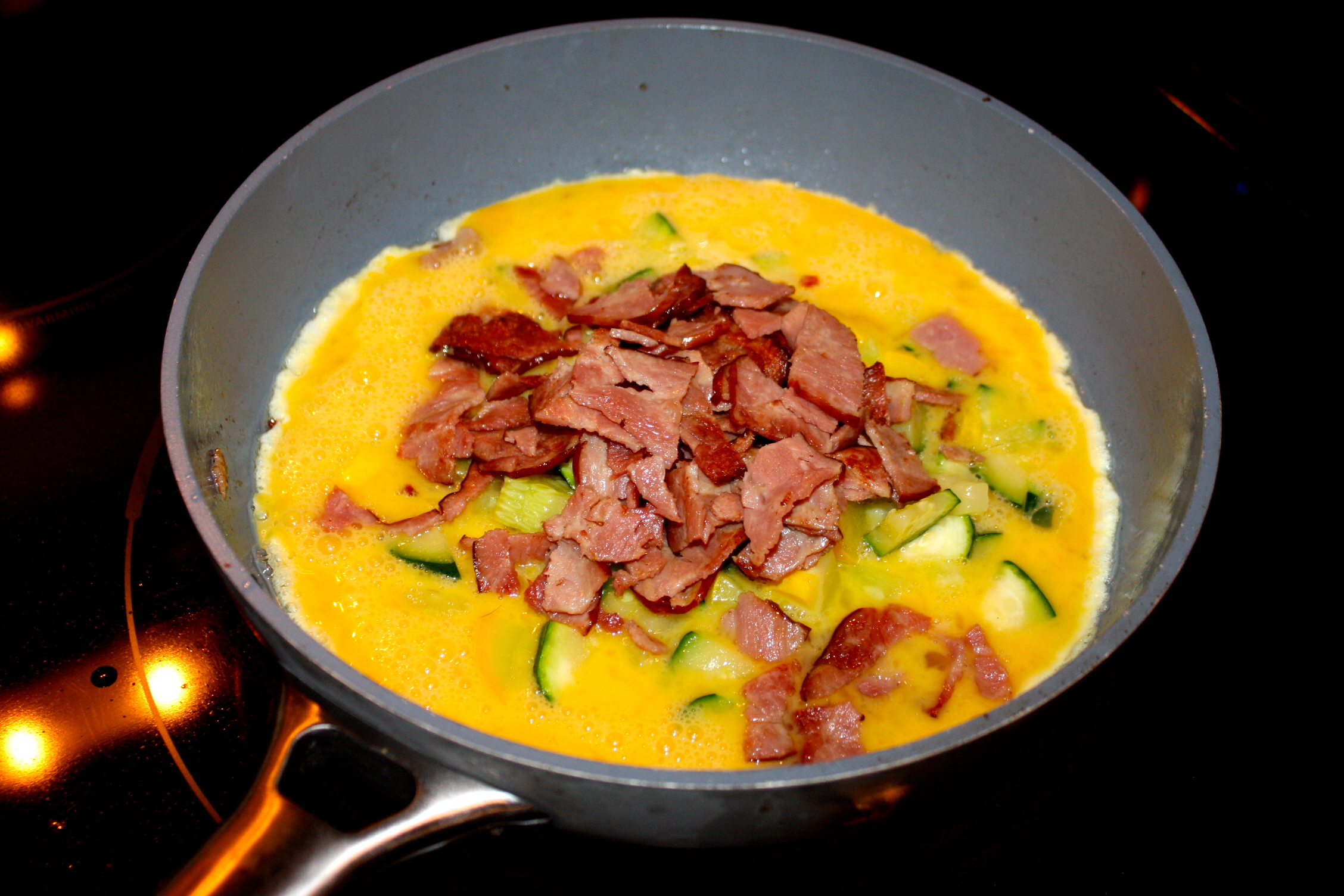 Applegate turkey bacon: cooked separately (FSG recommends cooking it ALL & keeping extra in fridge for easy adding)