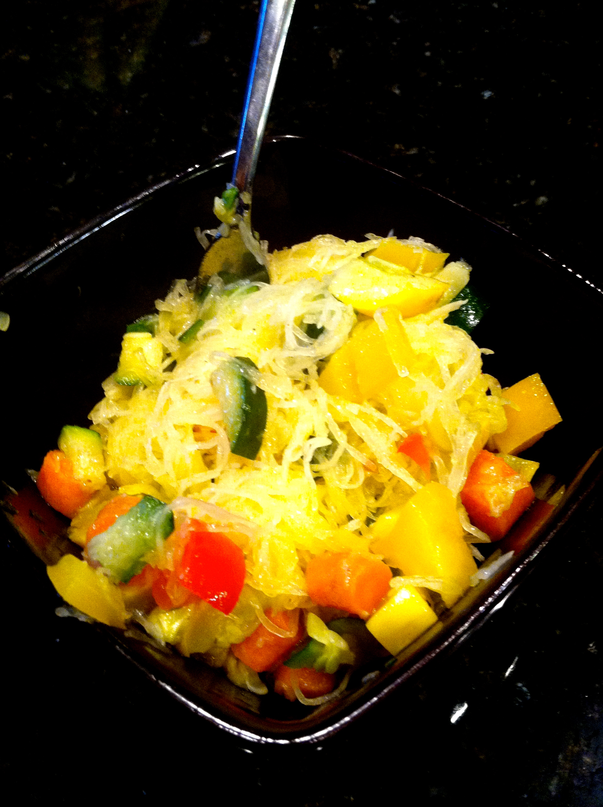 But the veggies didn’t stop there. They went on to fulfill their meal destiny two nights later when I hastily roasted spaghetti squash and turned it into a yogurt-less meal of squash overload that was amazing.