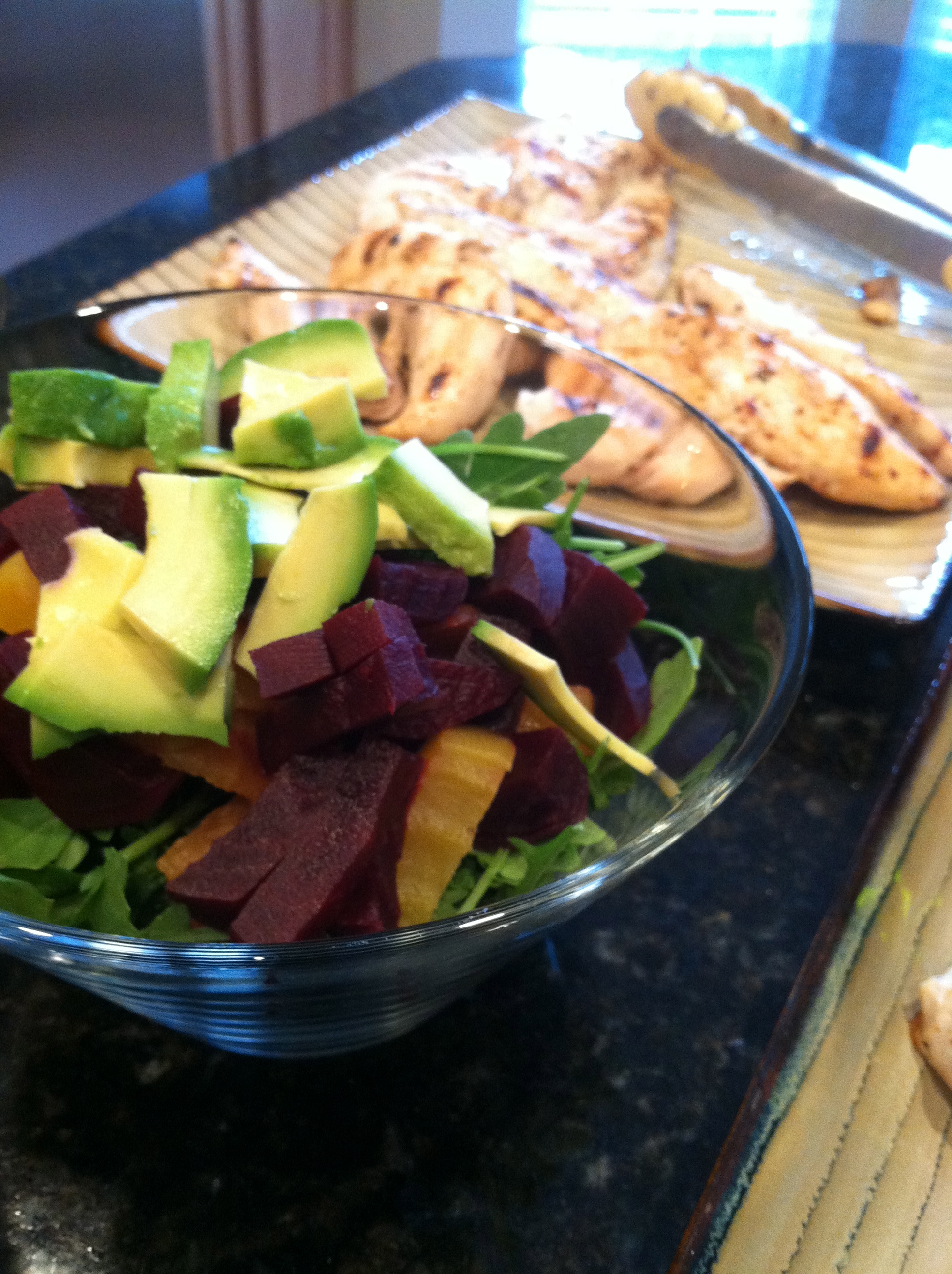 I peeled, chopped, and steamed the beets until they were tender, and let them cool to the side. Once the beets were cool, I added in some chopped avocado to top a bed of arugula for a beet + green salad. Since I haven’t been eating much dairy at all lately, I added a favorite little treat to the top of mine: local caromont goat cheese.