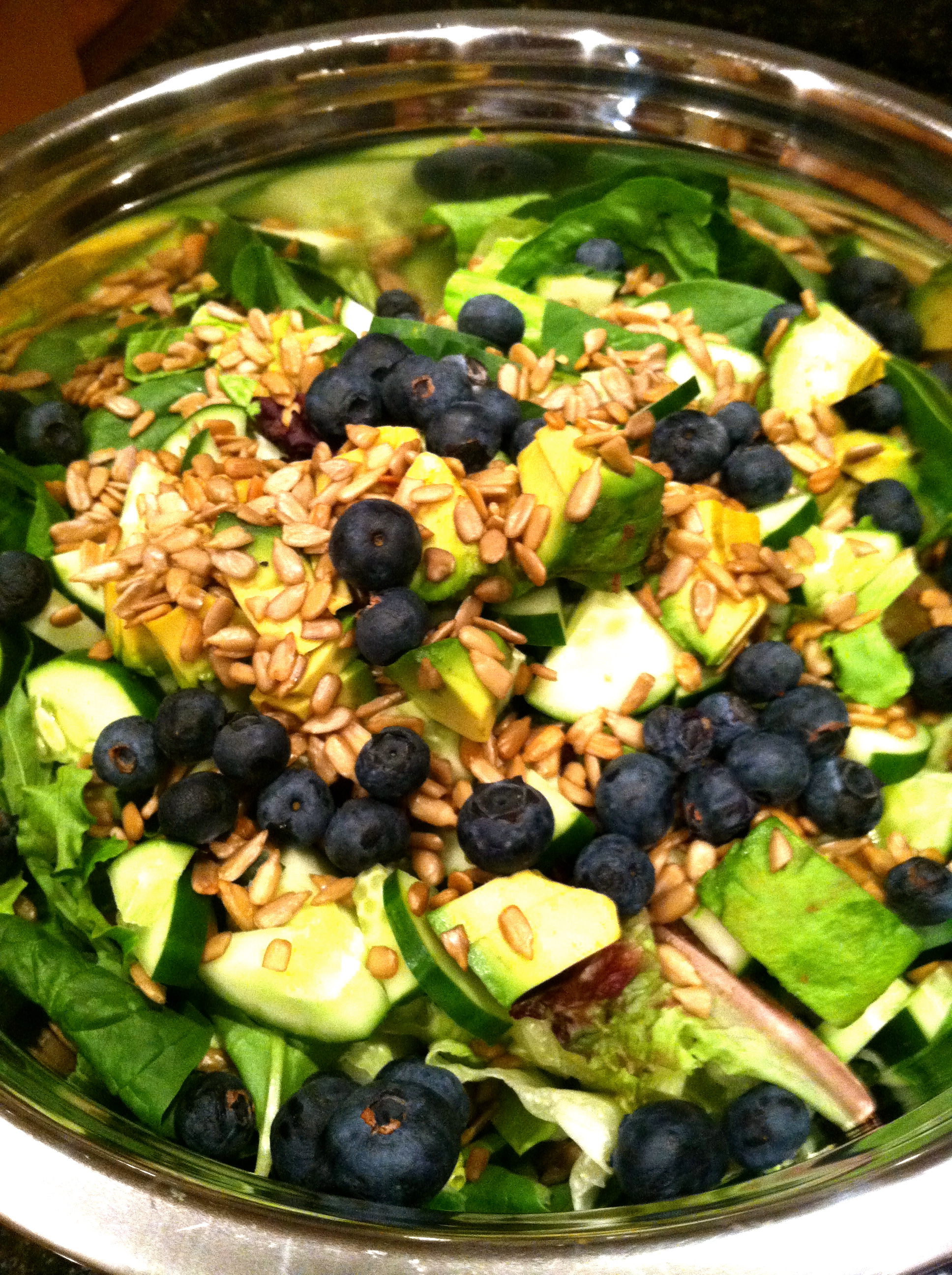 I made this salad. (You’re captivated already, I know.) In the spirit of my summer berry salad obsession, and because I had all the ingredients left over, this salad had romaine, spinach, avocado, cucumber, blueberries, and sunflower seeds.