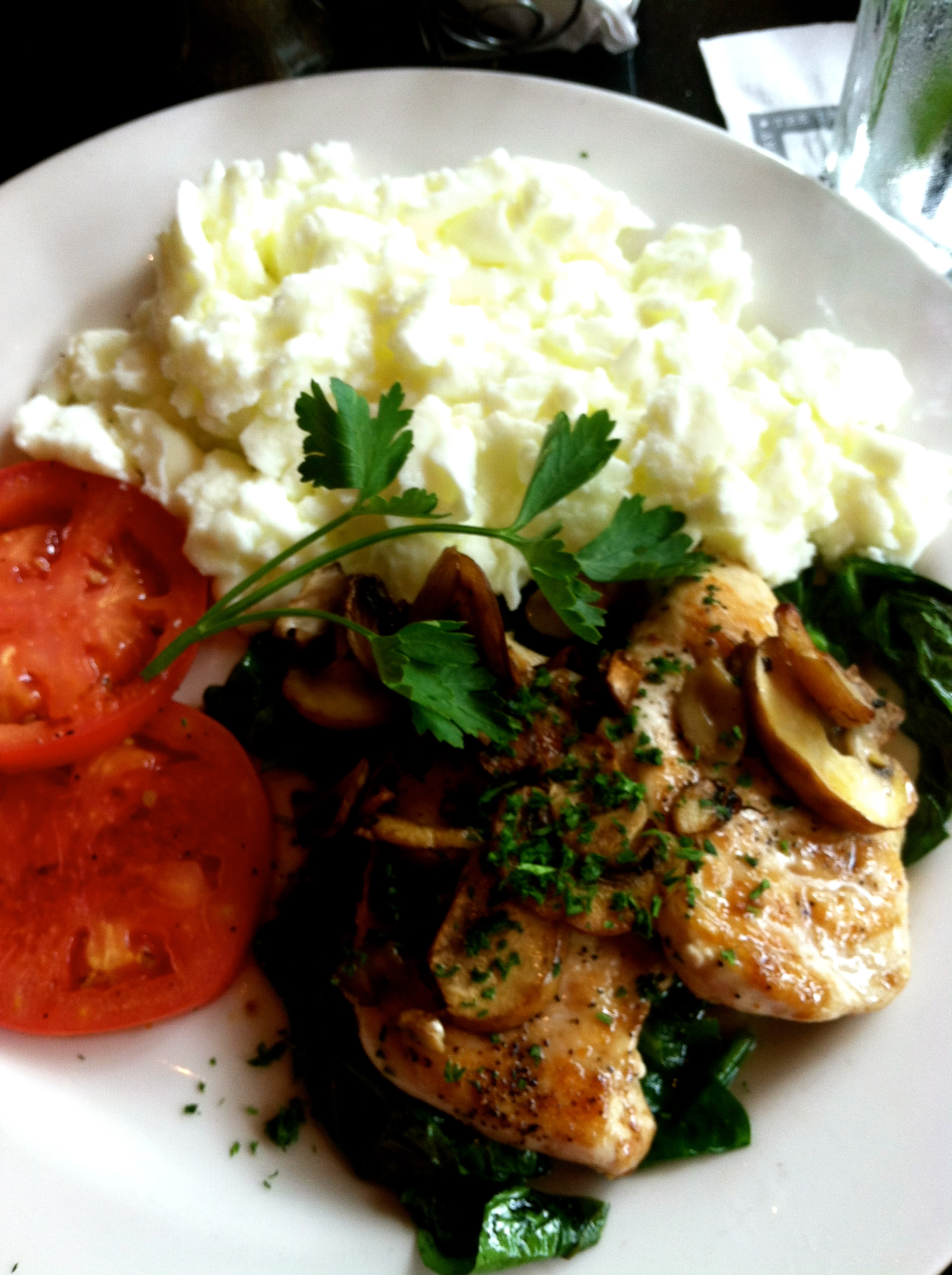 A (very) late breakfast at Cheesecake factory consisted of their Energy Breakfast: scrambled egg whites, roasted tomatoes, and grilled chicken over a spinach + mushroom sauté. It’s one of my favorite daytime items on their menu, and if you’re so inclined can be requested to NOT be cooked in butter.