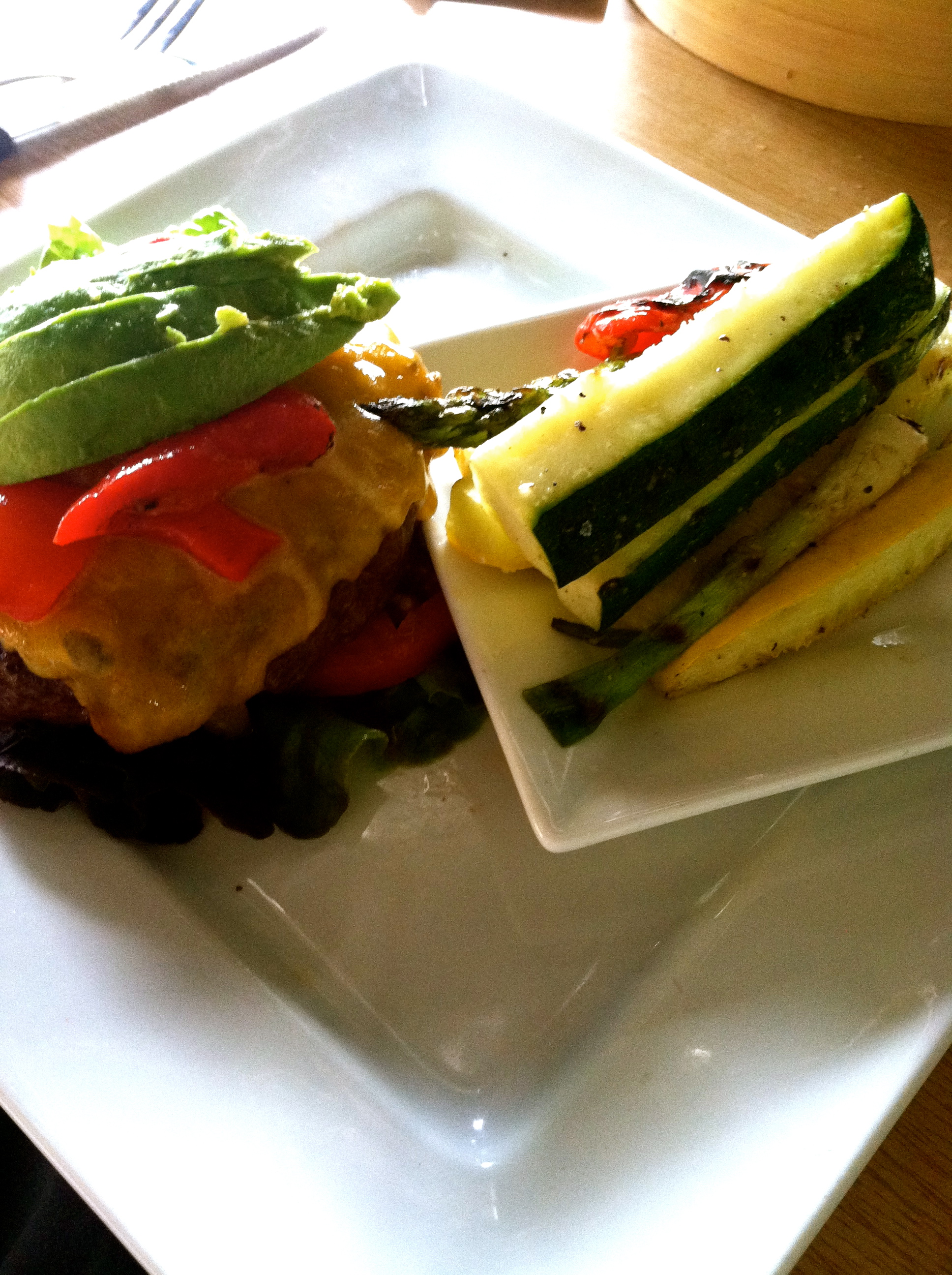 This particular meal was a create your own with a regular burger on a lettuce wrap (sort of…the lettuce wrap was kind of weak) with lettuce, tomato, onion, roasted red peppers, avocado, and a side of grilled veggies). I have to say, I have infrequently (in the past) opted for the veggies over their sweet potato fries, but the squash stalks were amazing.