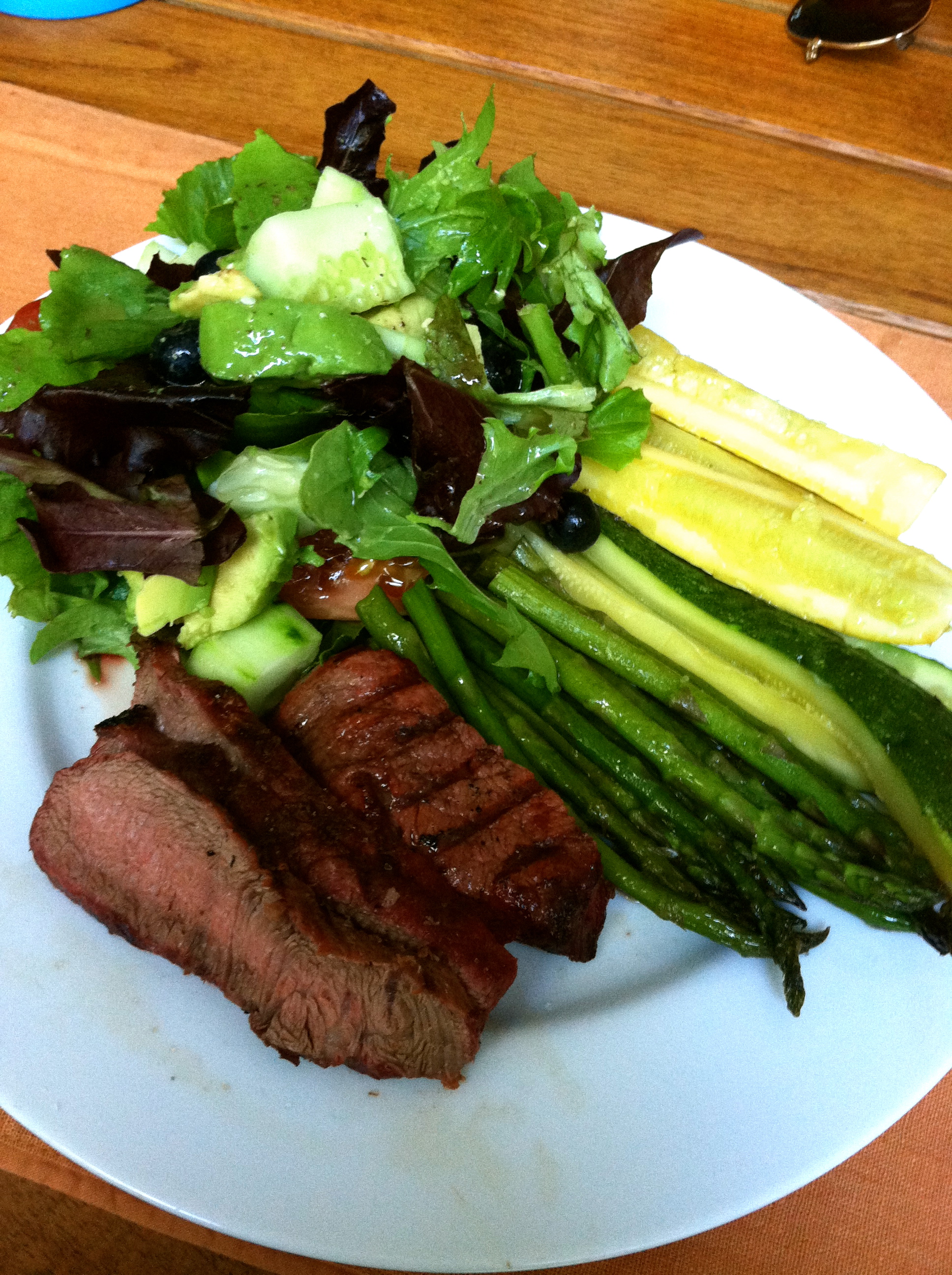We had amazing skirt steak and filets from Whole Foods, grilled zucchini + yellow squash, and a huge awesome salad, a la the summer fruit trend.