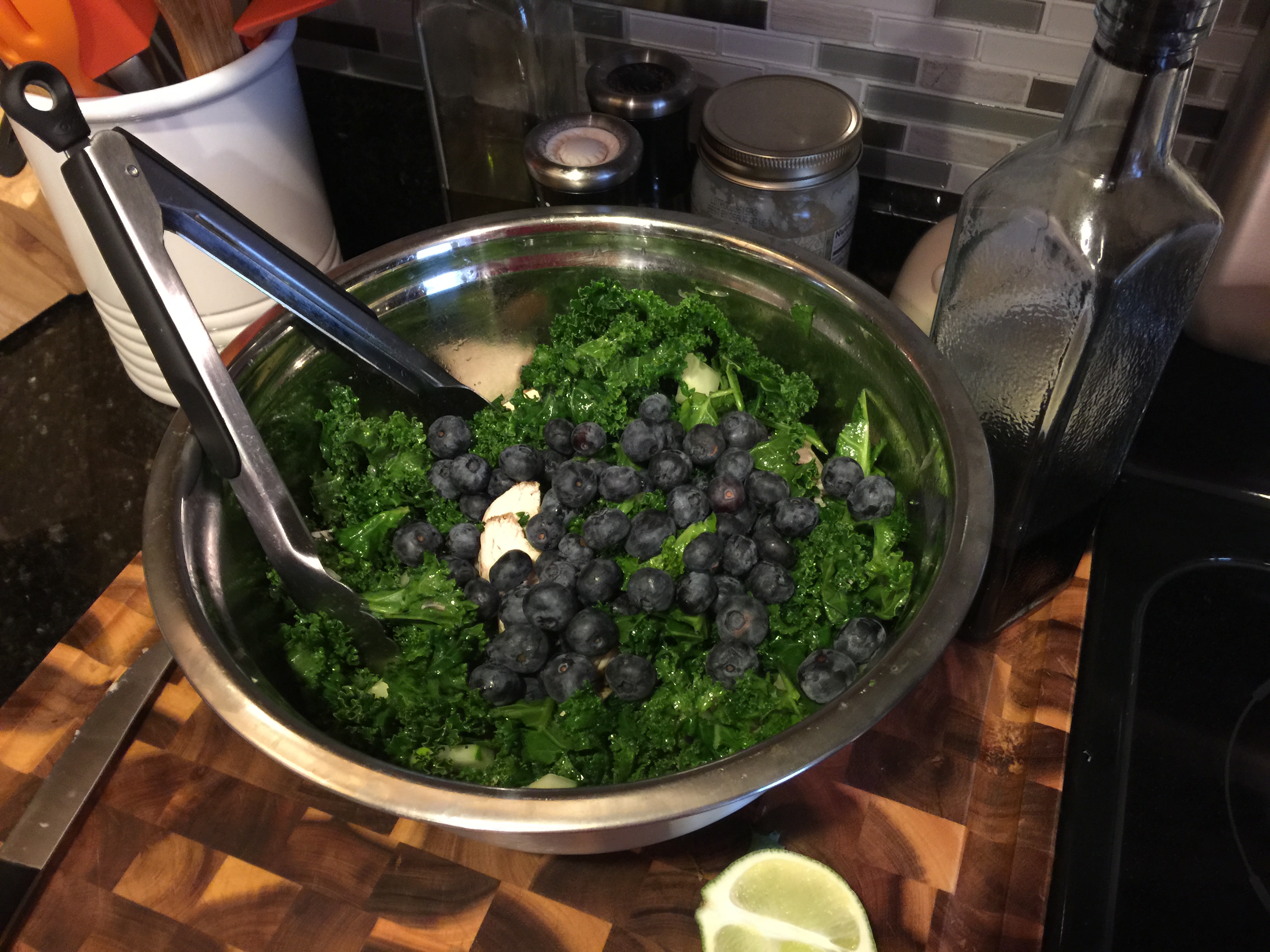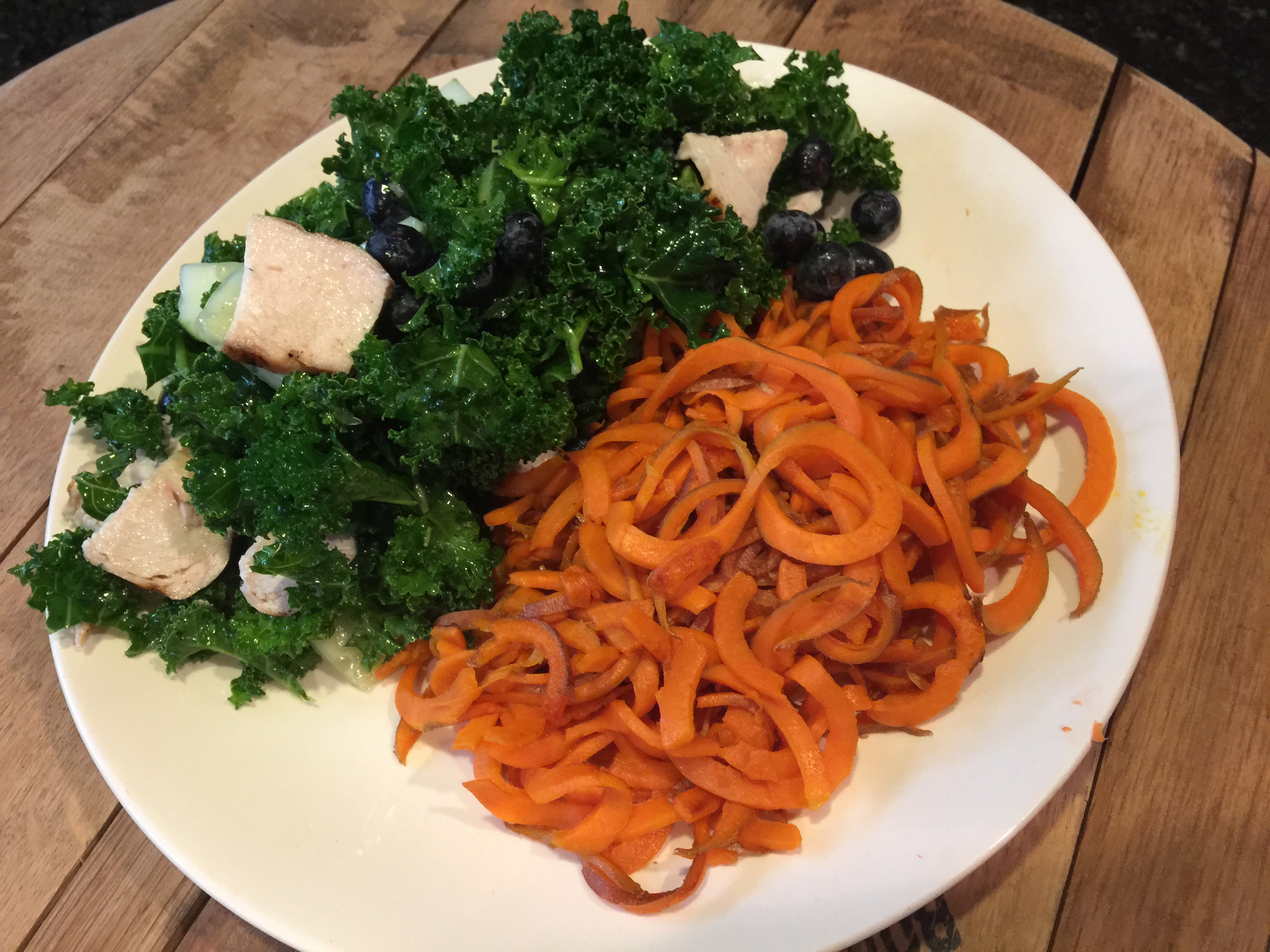 This salad wasn’t anything particularly special; just kale, blueberries, cucumber, and some leftover grilled chicken to give it a little boost — but to be honest, it didn’t need anything else [the dressing was fresh squeezed lemon juice, olive oil and sea salt sprinkled]. It stood just fine on it’s own, and was a great partner for my new favorite thing: sweet potato noodles.