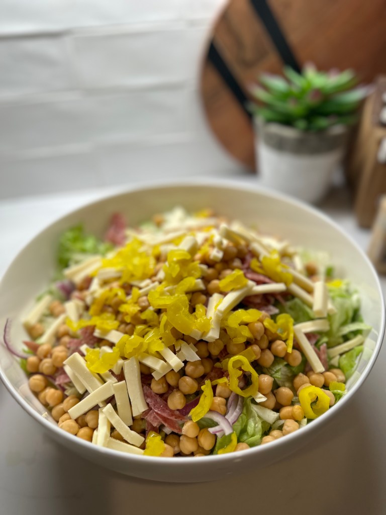 PSA: If you’re someone who meal plans for work, I recommend getting your container or larger Ball Jar out and putting the peppers, chick peas and onions at the bottom, then the salami, cheese, and finish with the lettuce on top to prevent wilting and soggy lettuce.